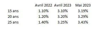 Rappelons qu’en Janvier 2022, les taux immobiliers moyens étaient de 1.07%, contre 3.12% en Mai 2023.
